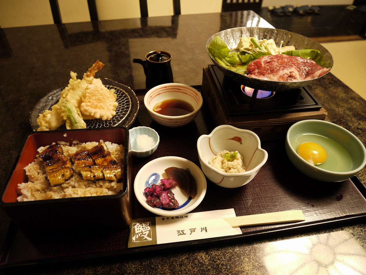 มีทั้งข้าวหน้าปลาไหล เทมปุระ และสุกี้ยากี้ ด้วยราคาเพียง 3,200 เยนค่ะ