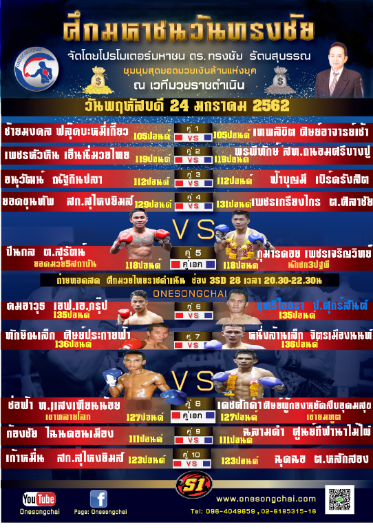 ศึกมหาชนวันทรงชัย วันพฤหัสบดีที่ 24 มกราคม 2562 เวทีมวยราชดำเนิน นัดสำคัญสุดยิ่งใหญ่