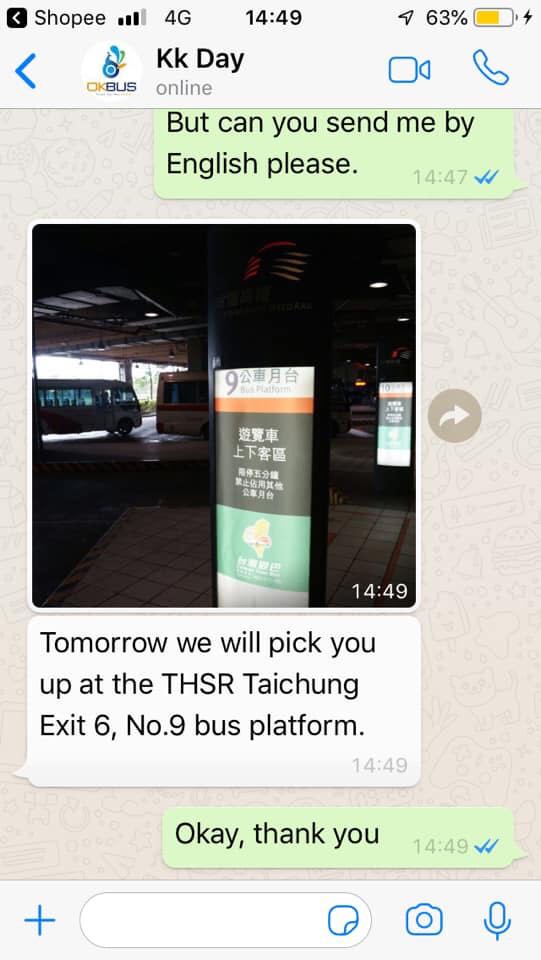 พอถึงสถานีไถจงแล้ว ก็ไปต่อเลยจ้า มีการคอนเฟิร์มจาก local supplier ของ kkday ติดต่อเรามาผ่านทาง whatsapp