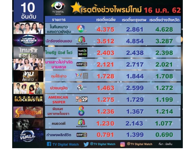 เรตติ้งรายการช่วงไพร์มไทม์วันที่ 17 ม.ค. 2562