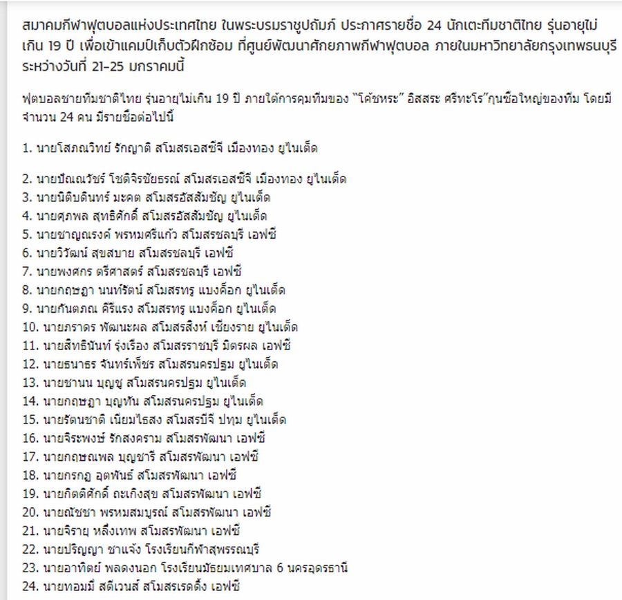 U 19 ที่โค้ชหล่ะเรียกตัวฝึกซ้อม ..ทำไมไม่มีรายชื่อ บุรีรัมย์เลยสักคนที่ติด