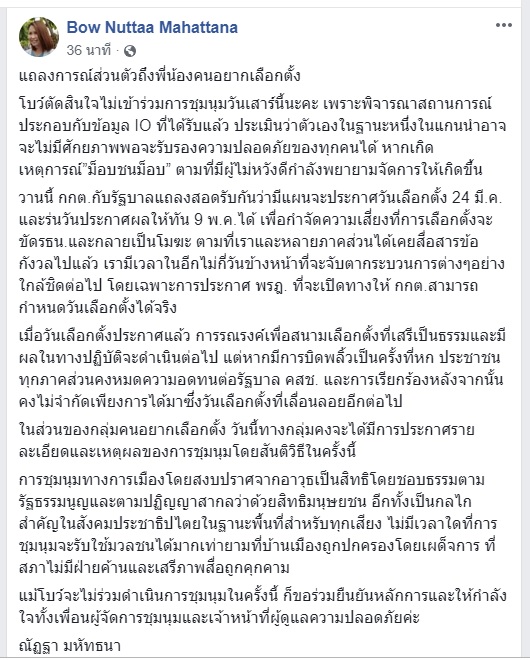 18 ม.ค.62 น.ส.ณัฏฐา มหัทธนา หรือ “โบว์” แกนนำกลุ่มคนอยากเลือกตั้ง โพสต์ข้อความลงบนเฟซบุ๊กส่วนตัว Bow Nuttaa Mahattana ระบุว่า แถลงการณ์ส่วนตัวถึงพี่น้องคนอยากเลือกตั้ง