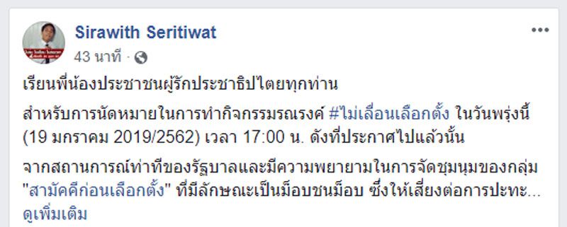 18 ม.ค.62 นายสิรวิชญ์ เสรีธิวัฒน์ หรือจ่านิว แกนนำกลุ่มคนอยากเลือกตั้ง ได้โพสต์ข้อความลงบนเฟซบุ๊กส่วนตัว "Sirawith Seritiwat" ระบุว่า เรียนพี่น้องประชาชนผู้รักประชาธิปไตยทุกท่าน