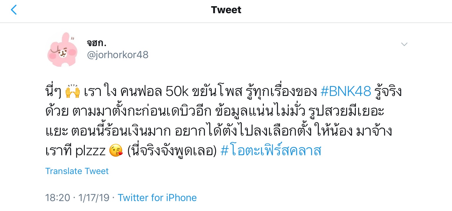 เมื่อวานนี้ (17 มกราคม 2019) ได้มีประเด็นหนึ่งที่ถูกพูดถึงในโซเชียลมีเดีย นั่นคือประเด็นบรรดาเซเลบในทวิตเตอร์ จู่ๆ ก็ลุกขึ้นมาโพสต์ถึงวงไอดอล BNK48 พร้อมกับแฮชแท็ก #โอตะเฟิร์สคลาส