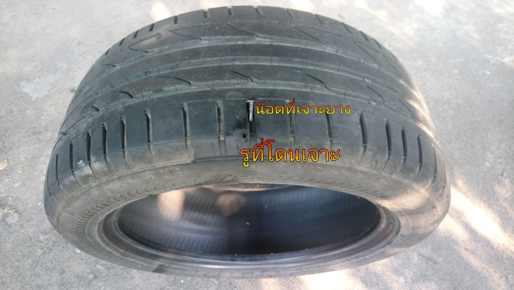 ยางรถยนต์ซึม สูบลมไม่นานก็อ่อน ไปให้ช่างที่ศูนย์ใกล้บ้านดู พบว่าโดนน๊อตเจาะตามภาพ