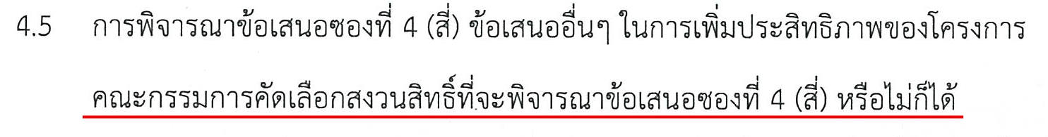 หากมีการระบุรายละเอียดเช่นนี้ ก็ย่อมหมายความว่า ซองที่ 4 จะไม่มีผลต่อการตัดสินผู้ชนะการประมูลในครั้งนี้ ก็เหลือเพียงแต่ว่าจะสามารถบรรลุข้อตกลงการเจรจาต่อรองได้เมื่อไหร่ ก็จะสามารถประกาศผู้ชนะการคัดเลือกได้ทันที