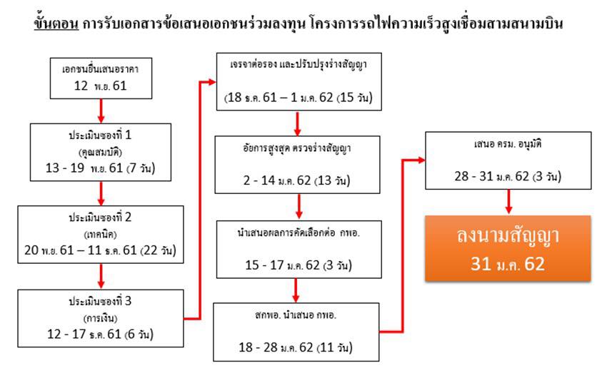 [Spoil] คลิกเพื่อดูข้อความที่ซ่อนไว้รักษาการ ผู้ว่าการการรถไฟแห่งประเทศไทย (รฟท.) เปิดเผยภายหลังเปิดซอง 4 และ พิจารณาข้อเสนอพิเศษของกลุ่มกิจการร่วมค้าบริษัทเจริญโภคภัณฑ์โฮลดิ้ง จำกัดและพันธมิตรว่า ทางกิจการร่วมค้าบริษัทเจริญโภคภัณฑ์โฮลดิ้ง จำกัด และพันธมิตรยื่นข้อเสนอพิเศษทั้งหมด 11 ข้อ โดยทางคณะกรรมการคัดเลือกประมูลรถไฟความเร็วสูงเชื่อม 3 สนามบิน ดอนเมือง สุวรรณภูมิ และอู่ตะเภา รับข้อเสนอได้เพียง 3 ข้อ เนื่องจากเป็นไปตามหลักการเพิ่มประสิทธิภาพของโครงการ ส่วนอีก 8 ข้อ ไม่เกี่ยวกับการเพิ่มประสิทธิภาพของโครงการ ทำให้ต้องมีการเจรจาเพิ่มเติมอีก ทำให้อาจจะเสนอคณะรัฐมนตรีเพื่อเซ็นสัญญาภายในวันที่ 31 มกราคม 2562 ตามกำหนดเดิมที่ได้ตั้งไว้ไม่ทัน และก็คงต้องเลื่อนการประกาศ และการก่อสร้างออกไปอย่างไม่มีกำหนด