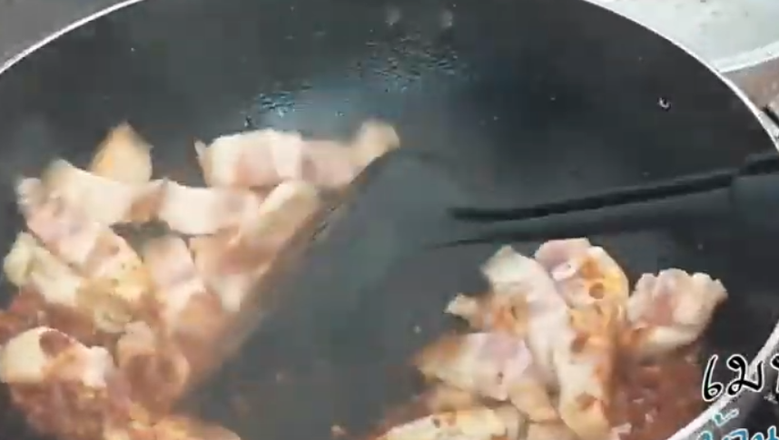 2.ใส่หมูสามชั้นต้มหั่นชิ้นลงไป