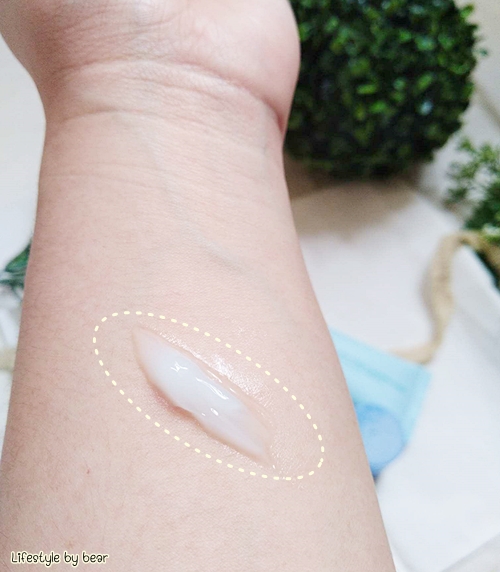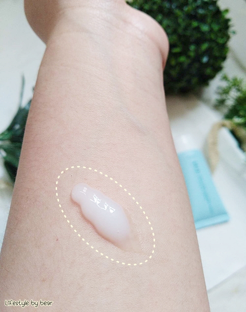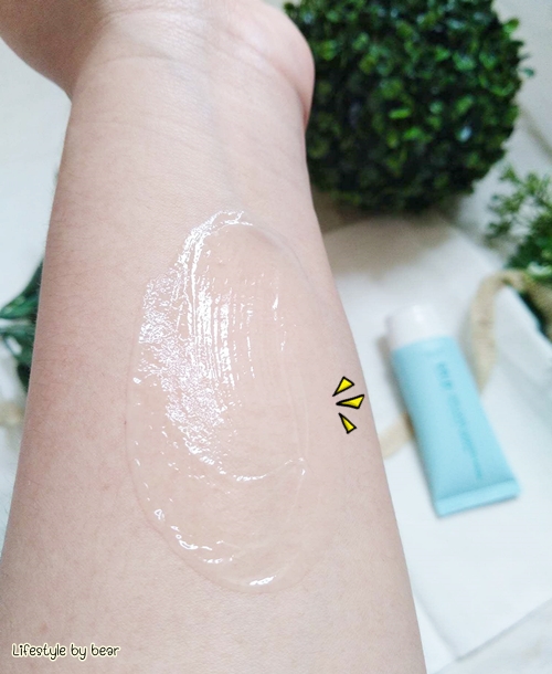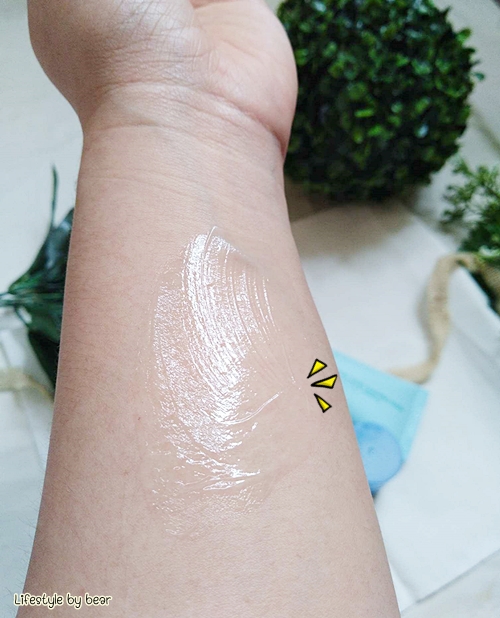 เนื้อผลิตภัณฑ์ : จะเป็นลักษณะเป็นเจลสีฟ้าใสๆ เกลี่ยง่าย ไม่หนักผิว ซึมลงผิวได้ดี