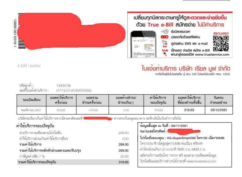 ใบแจ้งหนี้เดือน พย. 61 ระบุโปรเก่า 299 บาท