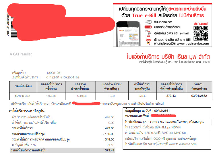 ใบแจ้งหนี้เดือน ธค. 61 ระบุโปรที่เลือกพร้อมซื้อเครื่อง 499 บาท