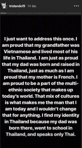 “ผมแค่อยากจะพูดคุยเรื่องนี้ให้ทุกคนเข้าใจ ผมมีความภูมิใจที่คุณปู่ของผมเป็นคนเวียดนาม และเขาใช้ชีวิตอยู่ในประเทศไทยมาตลอด ผมมีความภาคภูมิใจเหมือนกับคุณพ่อของผมที่เขาเกิดในประเทศไทย และได้รับการเลี้ยงดูอยู่ในประเทศไทยมาตลอด พอๆกันกับที่ผมมีความภาคภูมิใจที่คุณแม่ของผมเป็นคนฝรั่งเศส ผมภูมิใจที่มีส่วนหนึ่งในสังคมปัจจุบัน ที่มีหลายเชื้อชาติ หลายวัฒนธรรม เหมือนกับคนหลายๆ คนที่อยู่บนโลกใบนี้มาจนถึงปัจจุบัน