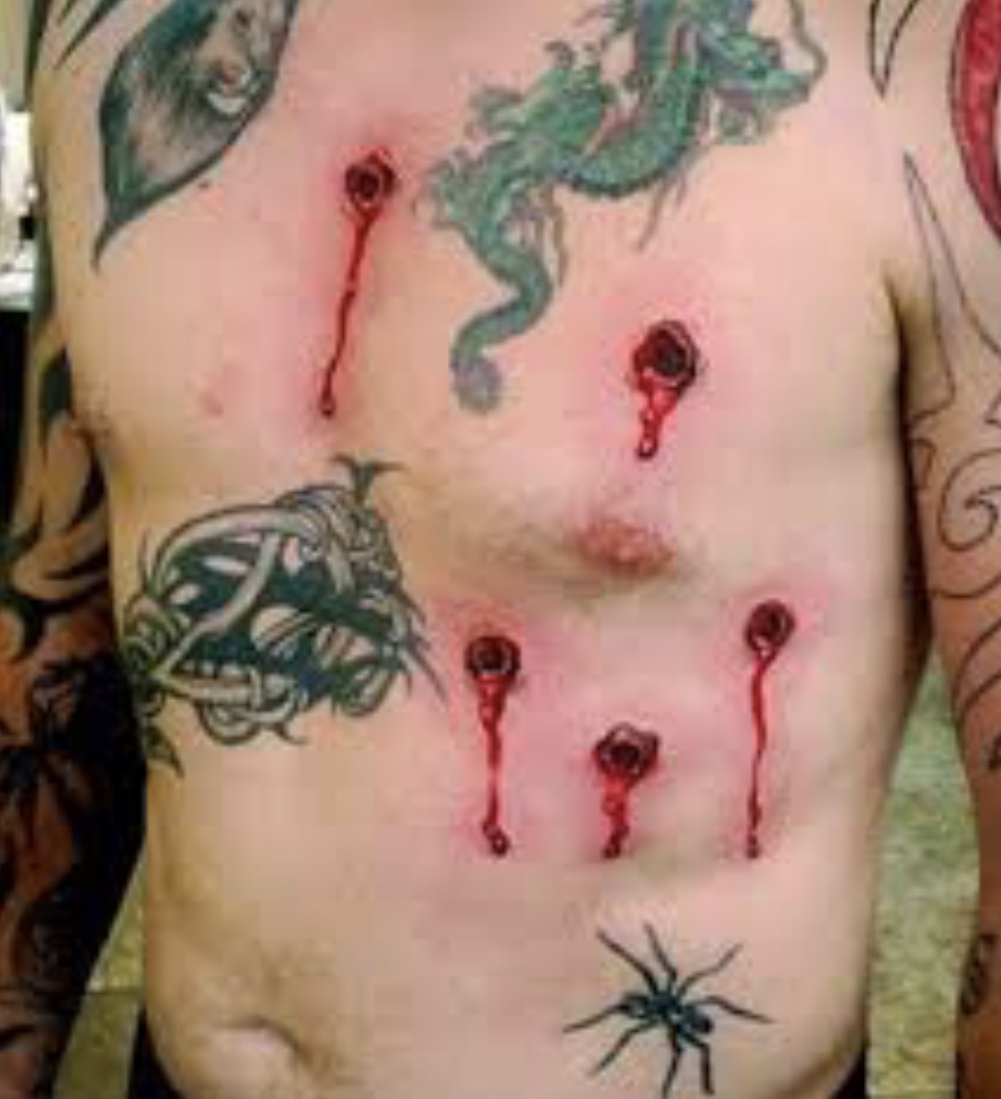 รายที่ 6 ปืนขนาด .45 หัว fmj สองนัด เข้าพุงนัดนึง อีกนัดเข้าไหปลาร้า