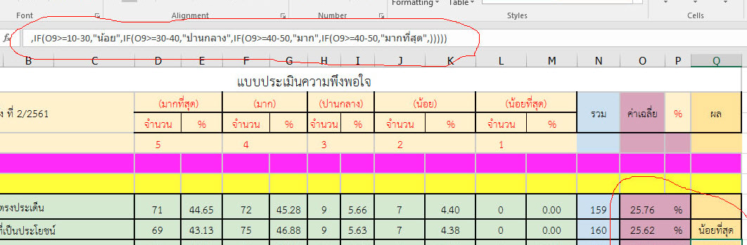 =IF(O9 >= 50 , "มากที่สุด" , IF(O9 >= 40 , "มาก" , IF(O9 >= 30, "ปานกลาง" , IF(O9 >=10, "น้อย" , "น้อยที่สุด" ) ) ) )