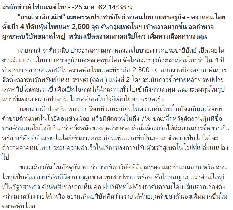 กรณ์ แห่งปชป. ตั้งเป้า 4 ปี ดันหุ้นไทยแตะ 2500 จุด