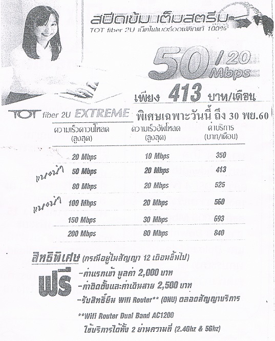 เคยใช้ TOT Fiber 100/20 ราคา 560+vat/เดือน นาน 1 ปี