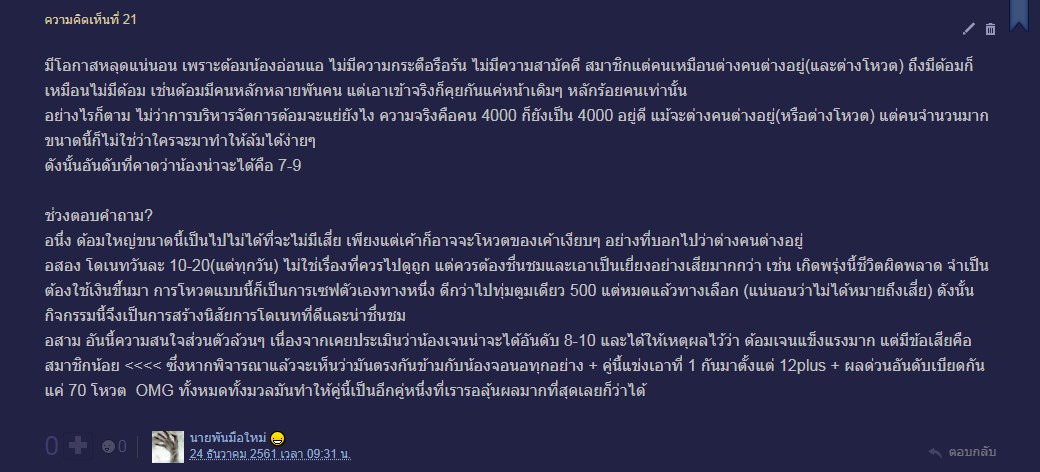 ซึ่งแน่นอนว่าความเห็นของผมไม่ได้มีความสำคัญอะไร และเป็นเพียงแค่ความคิดเห็นของใครก็ไม่รู้ 1 ใน 70 ล้านคน แต่ตอนนั้นตัวผมได้เป็นคนพิมพ์เองทั้งหมดครับ ไม่มีใครมาบังคับจับมือให้ผมพิมพ์ และผมได้ให้ความคิดเห็นแย่ๆ เอาไว้ ผมวิเคราะห์ไปในสิ่งที่เป็นแง่ลบมากๆ แล้วในตอนนี้ ณ วันนี้ ผมได้รู้แล้วครับว่าผมคิดผิด สิ่งที่ผมพิมพ์ไม่ได้เป็นความจริงเลย วันนี้ผมตกใจมาก พวกคุณสุดยอดกันจริงๆ ผมเห็นแล้วว่าพวกคุณรักน้องกันมากแค่ไหน และทุกอย่างที่ทำเพื่อน้องขนาดไหน ยังไงก็ตามผมขอโทษอีกครั้ง และในวันนี้ขอเป็นอีก 1 เสียง ที่จะแสดงความยินดีกับแฟนคลับน้องทุกคน และรวมไปถึงตัวน้องเองด้วยนะครับ