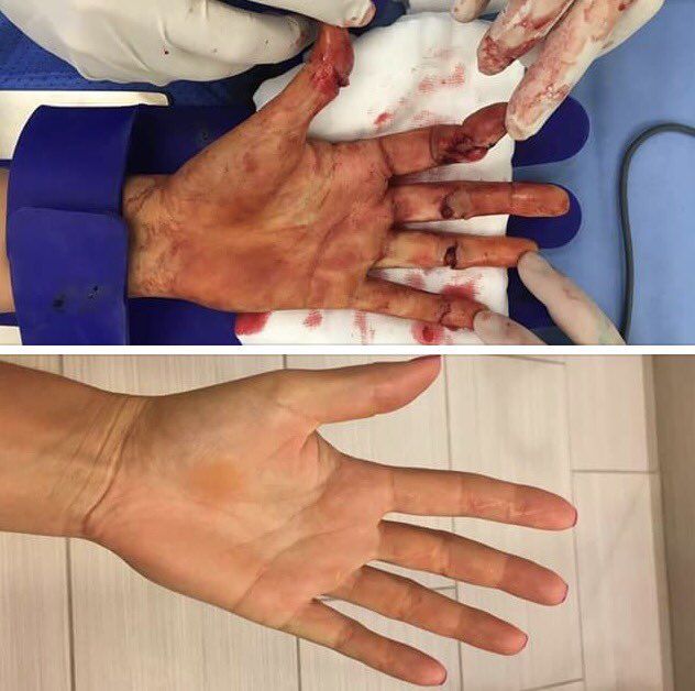 ศัลยแพทย์ทางมือได้ผ่าตัด เย็บซ่อมเอ็นที่บาดเจ็บ 5 นิ้ว รวมถึงเส้นประสาทอีก 2 นิ้ว ใช้เวลาผ่าตัดไป 3 ชม. 45 นาที