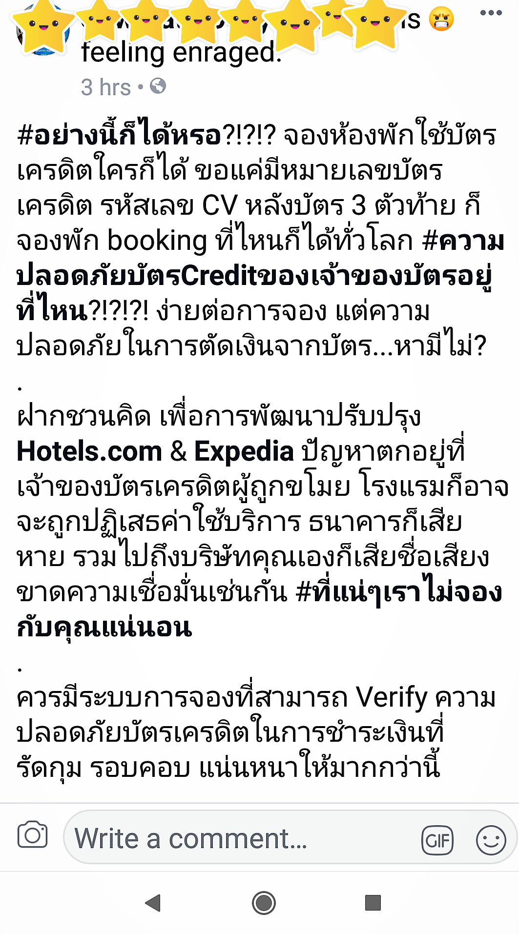 และได้ติดต่อทาง Expdia.com และ Hotels.com ซึ่งทางนั้นแจ้งว่า ทางบริษัทไม่มีระบบ security เกี่ยวกับ " Verified " บัตร ขอแค่มี เลขบัตร วันหมดอายุ และ เลข CCV - ตัวหลังบัตรเท่านั้นเป็นอันใช้ได้