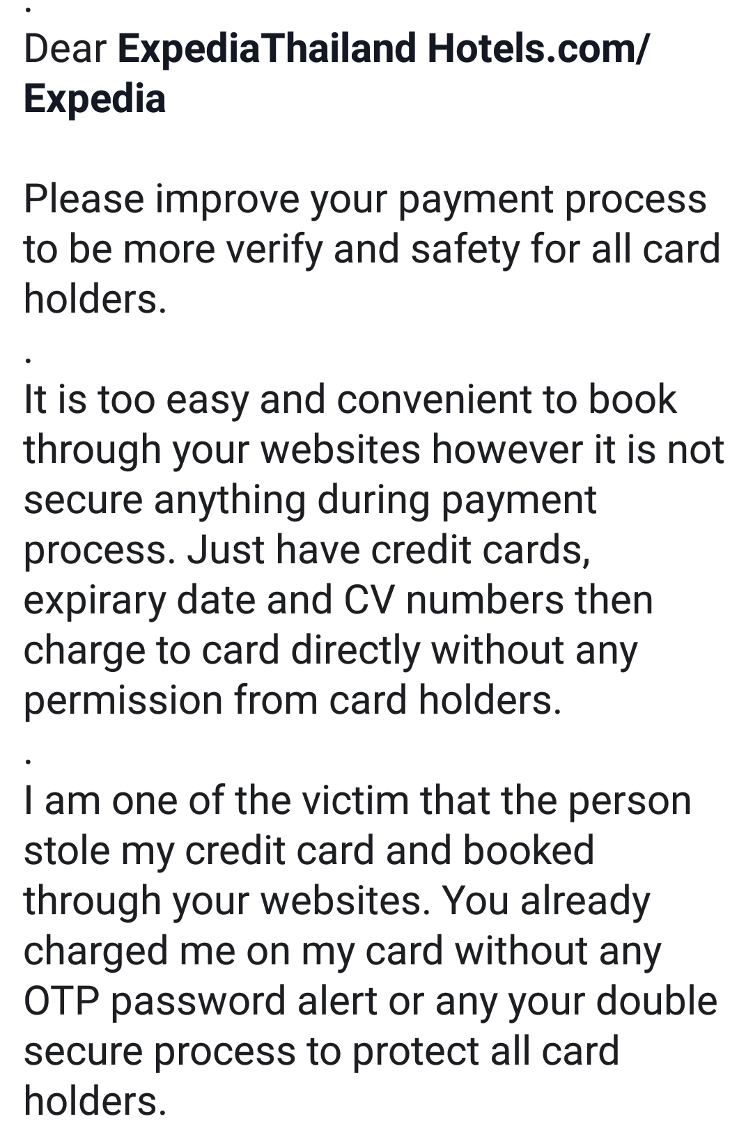 แต่เกิดกับน้องร่วมงาน เรื่องมีอยู่ว่า บัตรเครดิตธนาคารสีเหลืองของน้อง " โดนขโมย " และนำไปจองห้องพัก กับทาง #Expdia.com และ Hotels.com