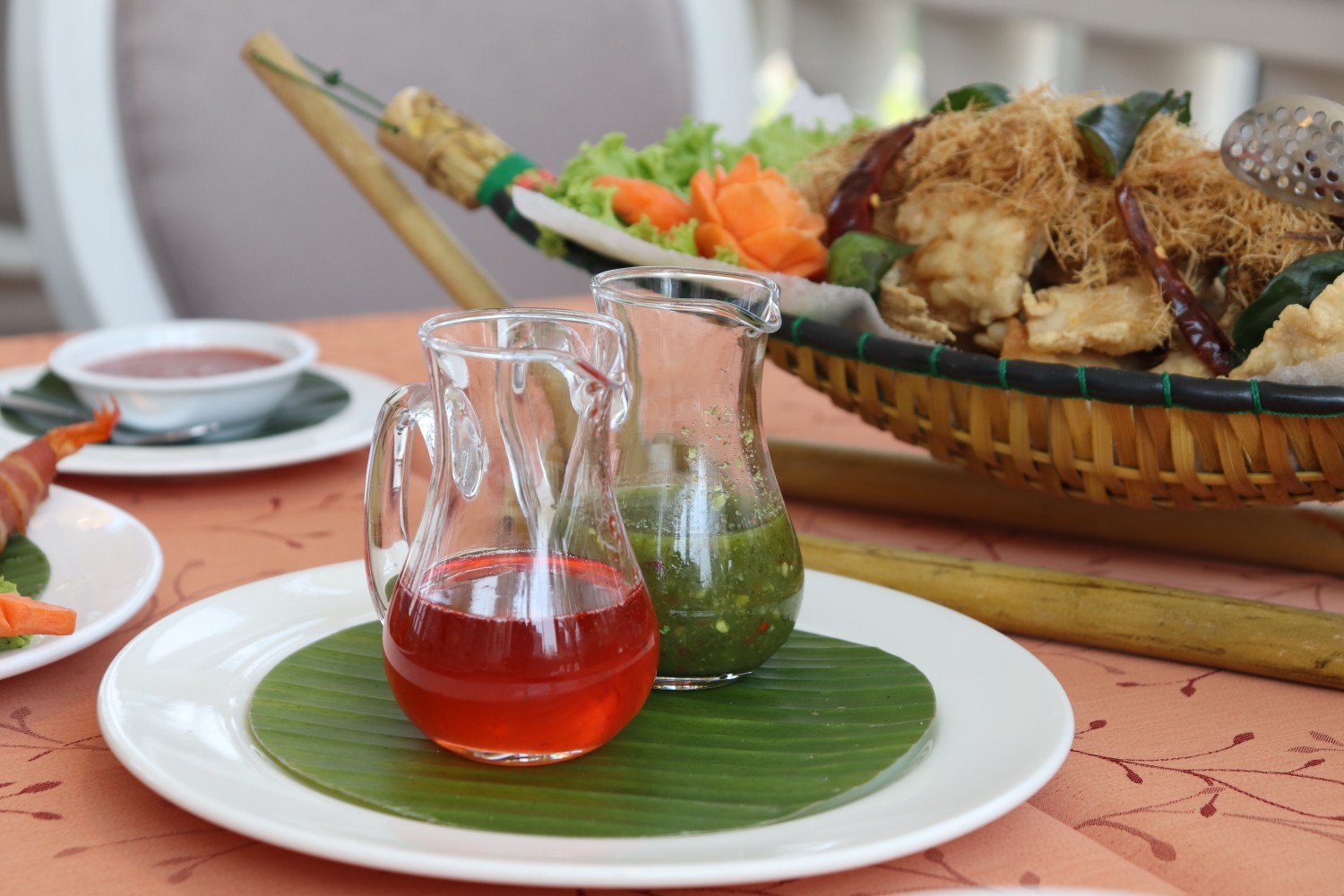 น้ำจิ้มจะมีสองแบบนะคะ มีเป็นน้ำจิ้มสีฟู้ดสีเขียวและน้ำจิ้มน้ำยาอุทัยที่เป็นจุดเด็นของร้านอาหารบ้านหมอมี รสชาติของน้ำจิ้มสีแดงจะมีรสหวานนิดๆ อร่อยดีค่ะ
