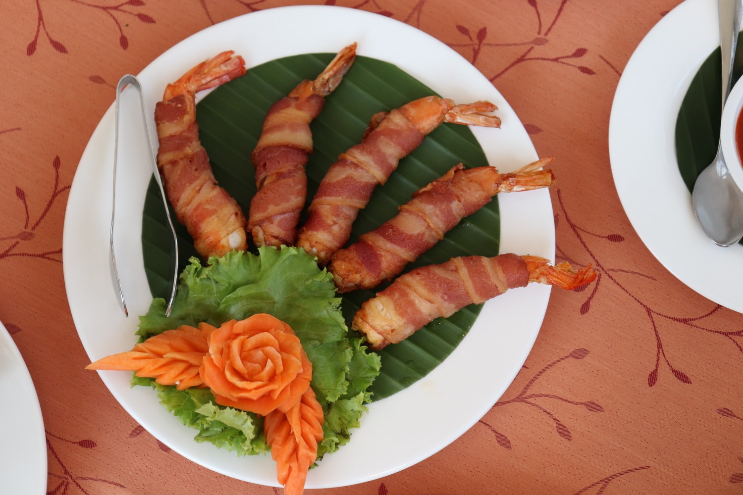 มาถึงเมนูที่อยากแนะนำสำหรับคนชอบของทอดค่ะ เมนูนี้ชื่อว่า กุ้งพันเบคอนทอด พันเบคอนมาแบบเต็มแผ่นเลยค่า รสชาติจะออกเค็มนิดๆ ซึ่งเป็นรสชาติเค็มแบบธรรมชาติของเบคอนอยู่แล้ว