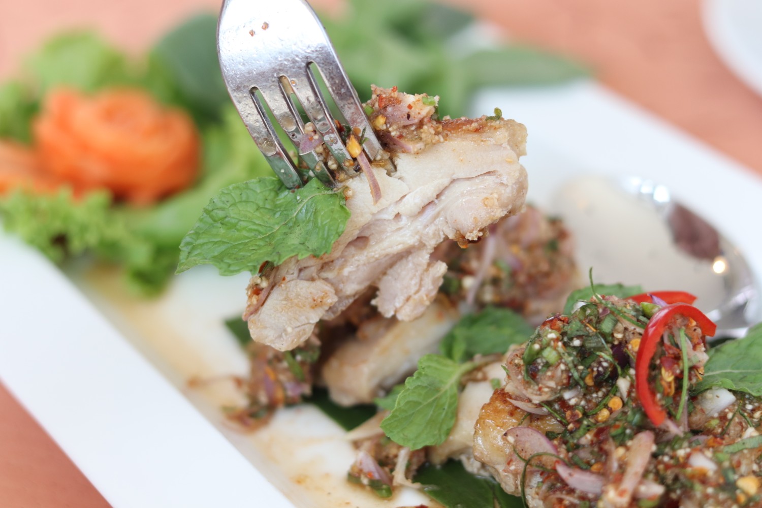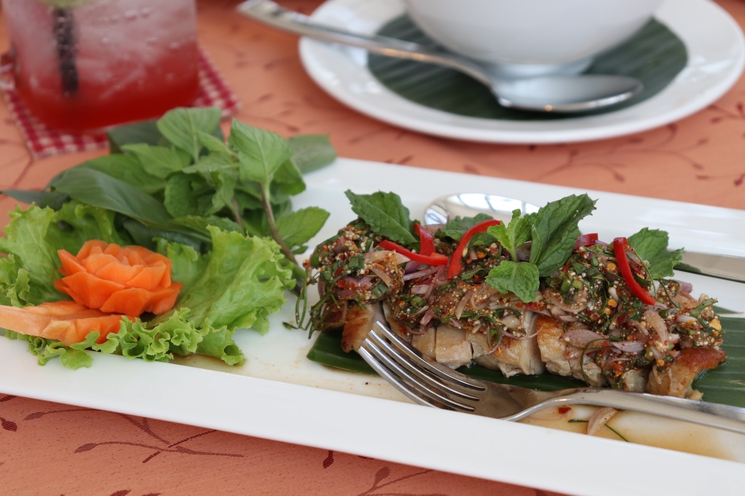 เมนูต่อมาเป็นน้ำตกไก่ย่างค่ะ รสชาติกำลังดี ไม่เผ็ดเกินไป แต่ยังมีความเข้มข้นอยู่ อร่อยดีค่ะเมนูนี้ แถมเนื้อไก่ยังมาแบบเป็นชิ้นใหญ่ๆ ด้วยค่ะ ราคาจานนี้อยู่ที่ 180 บาทนะคะ