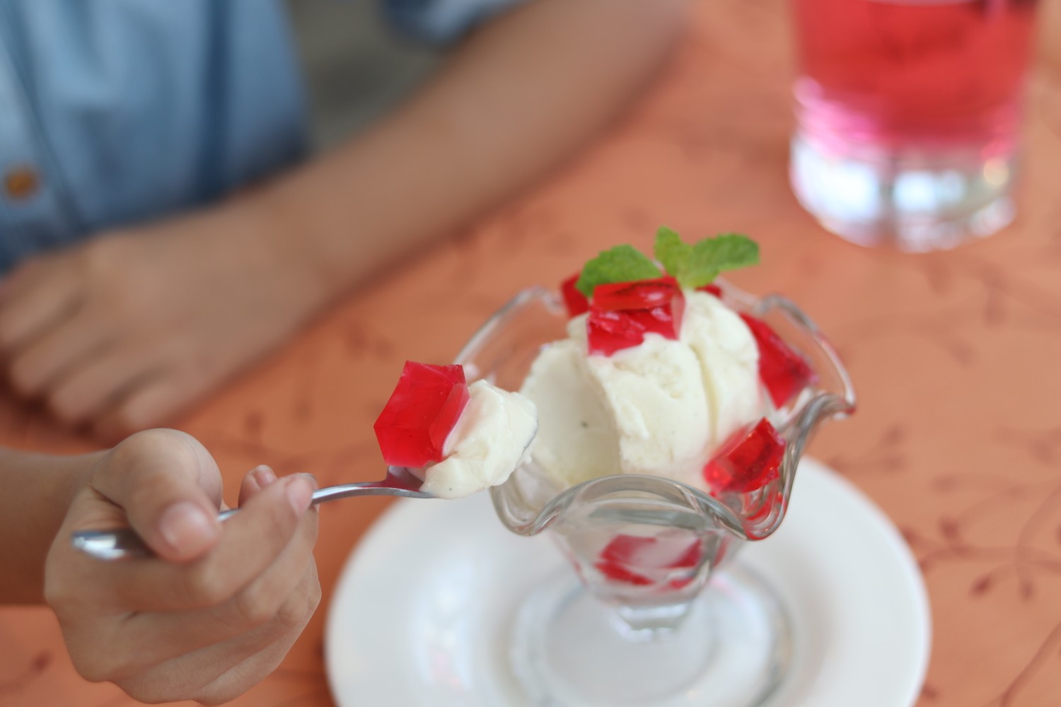 มาถึงของหวานกันบ้างดีกว่านะคะ ขนมหวานของเด็กน้อยไม่พ้นไอศกรีม เมนูของหวานนี้มีชื่อว่า วนิลา เยลลี่ เป็นไอศกรีมรสวนิลา พร้อมเยลลี่สีแดงๆ เจ้าตัวเล็กบอกว่าอร่อยมากๆ เลยค่ะ ถ้วยนี้ราคาอยู่ที่ 150 บาทค่ะ
