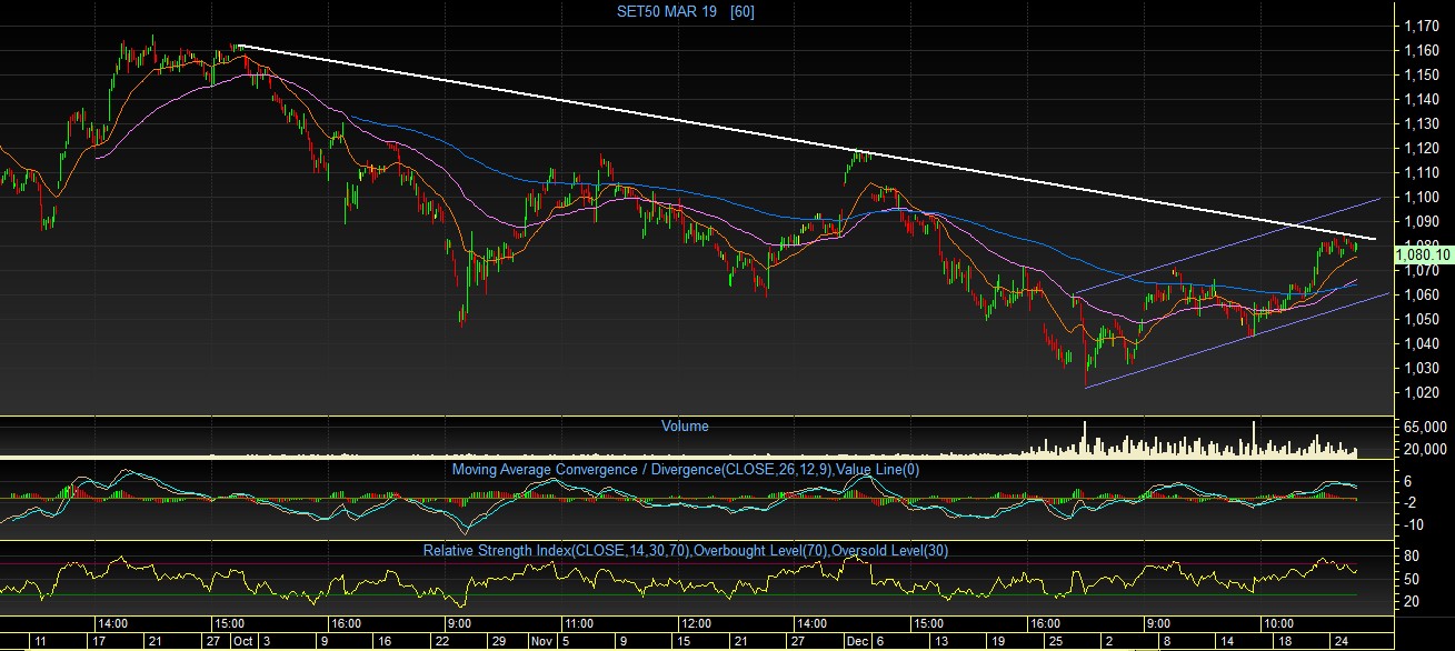 ดัชนีไม่สามารถยืน 1090 จุดได้ อาจจะเห็นการย่อตัวของดัชนีได้อีกครั้ง /แต่ถ้าหากยืน 1090 ได้อย่างแข็งแกร่งมั่นคง ก็จะทำให้ภาพ “Sideways Down” ค่อยๆจางหายไปในที่สุด และ พร้อมทะยานสู่ดวงดาวอันไกลโพ้น