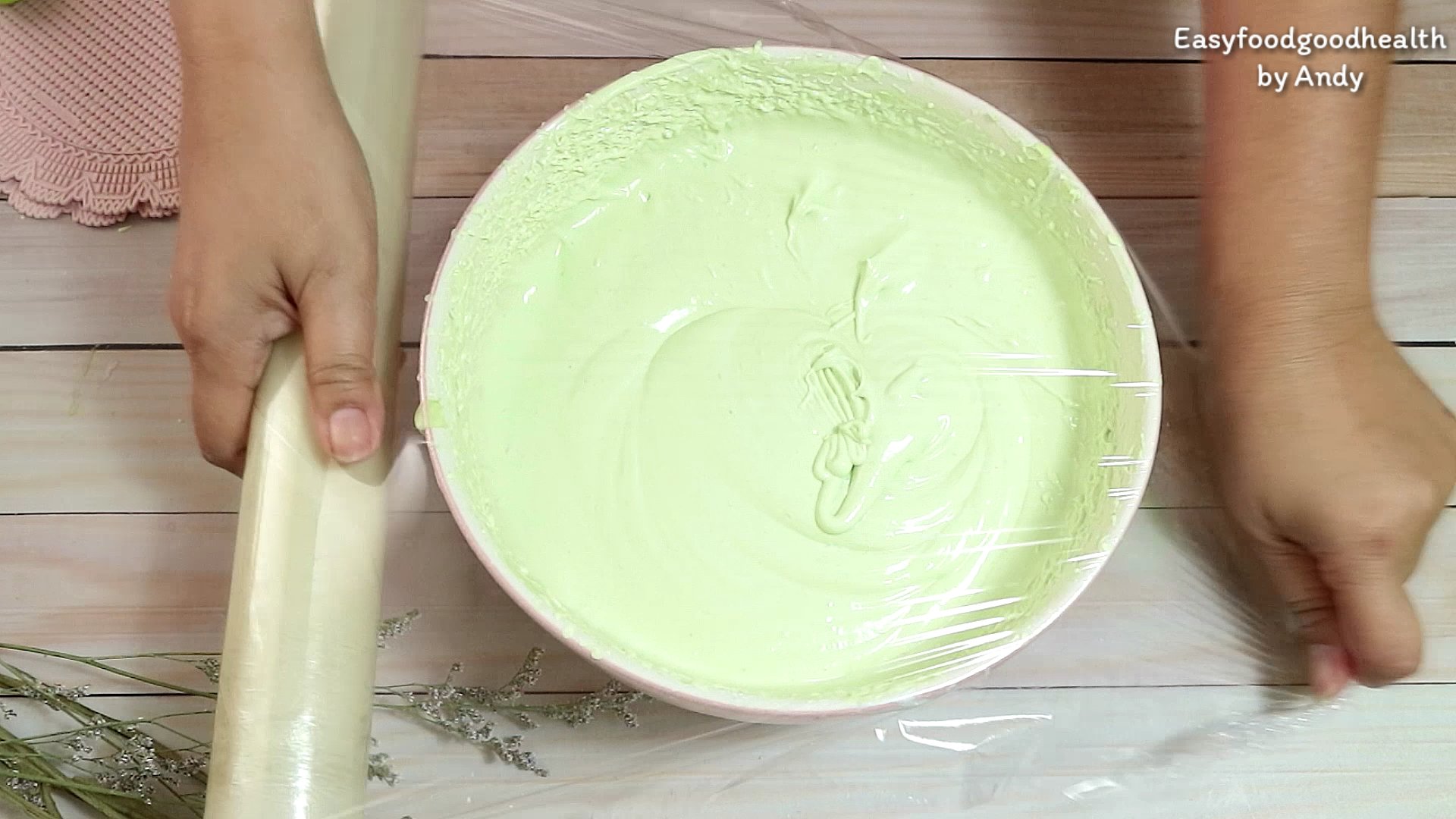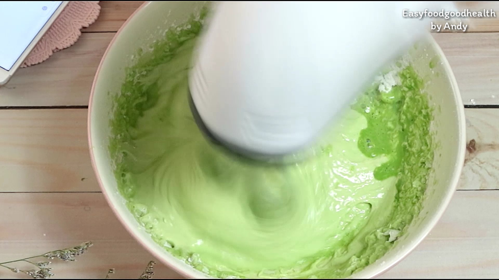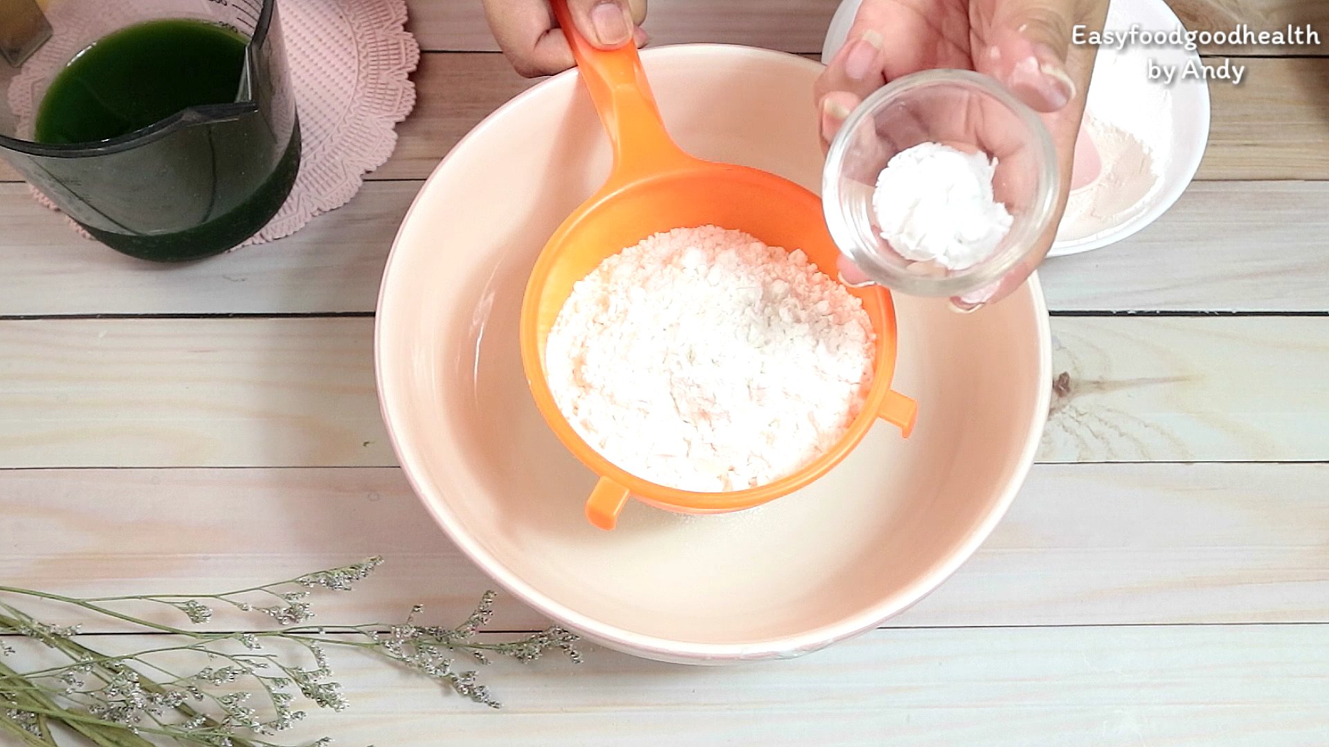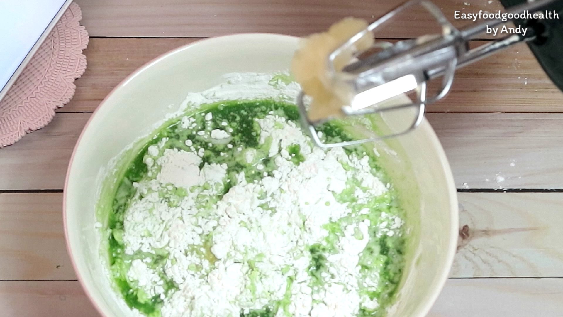 1.ร่อนแป้งและผงฟูใส่ชามผสมจากนั้นใส่ไข่ไก่ น้ำตาลทราย น้ำใบเตยลงไป คนด้วยไม้พาย1รอบ