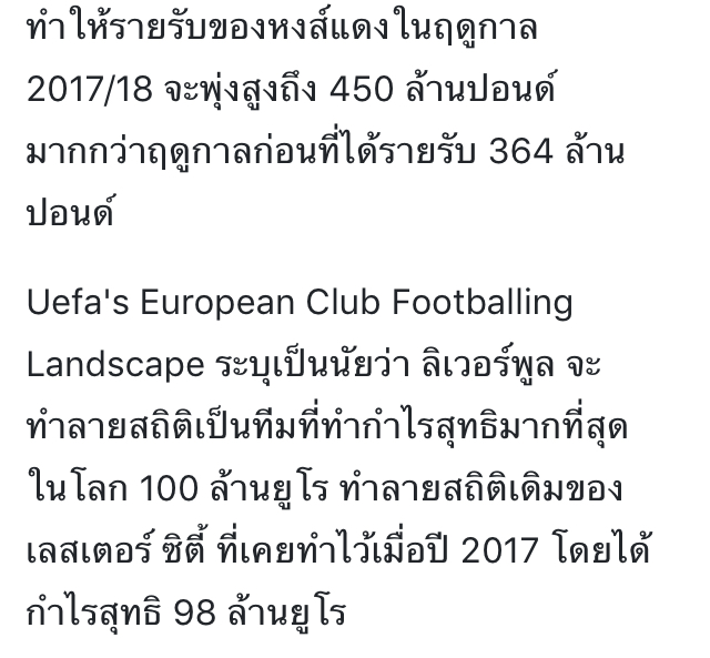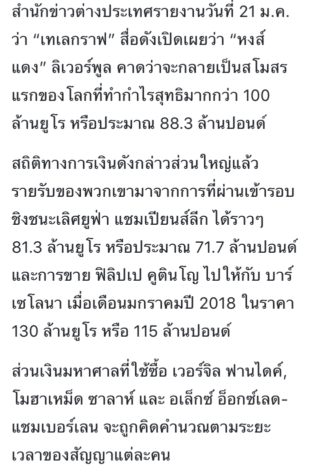 “ลิเวอร์พูลคาดว่าจะกลายเป็นสโมสรแรกของโลกที่ทำกำไรสุทธิมากกว่า 100 ล้านยูโร หรือประมาณ 88.3 ล้านปอนด์”