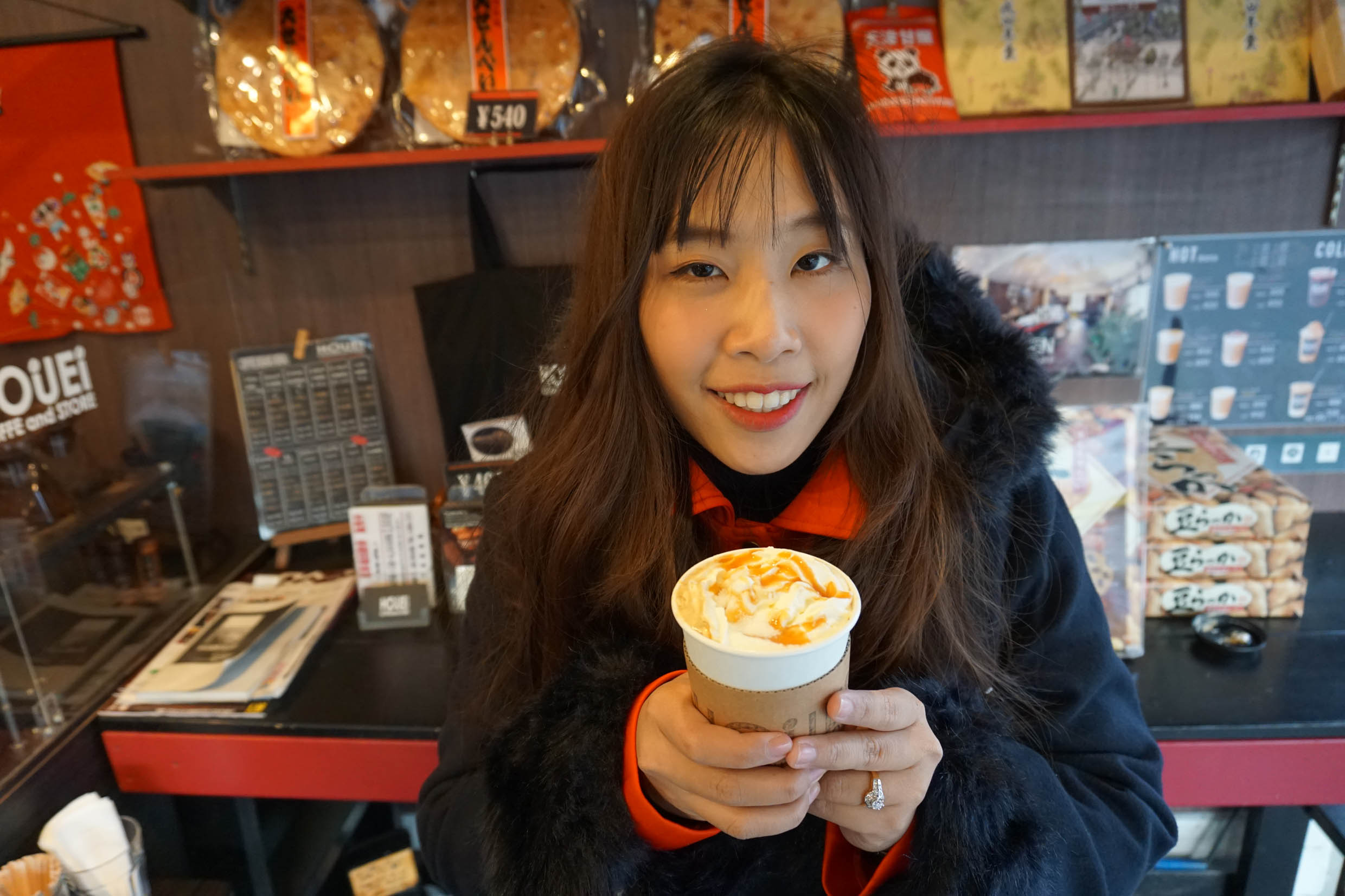 พิกัดร้านกาแฟ อยู่ตรงทางเดินเข้าวัดเลย แก้วล้ะ 550 เยน อร่อยละมุนมากค่ะ ไม่หวานมาก