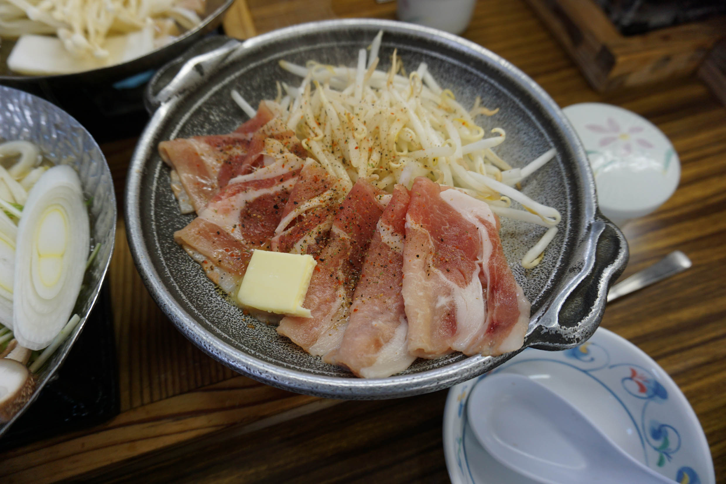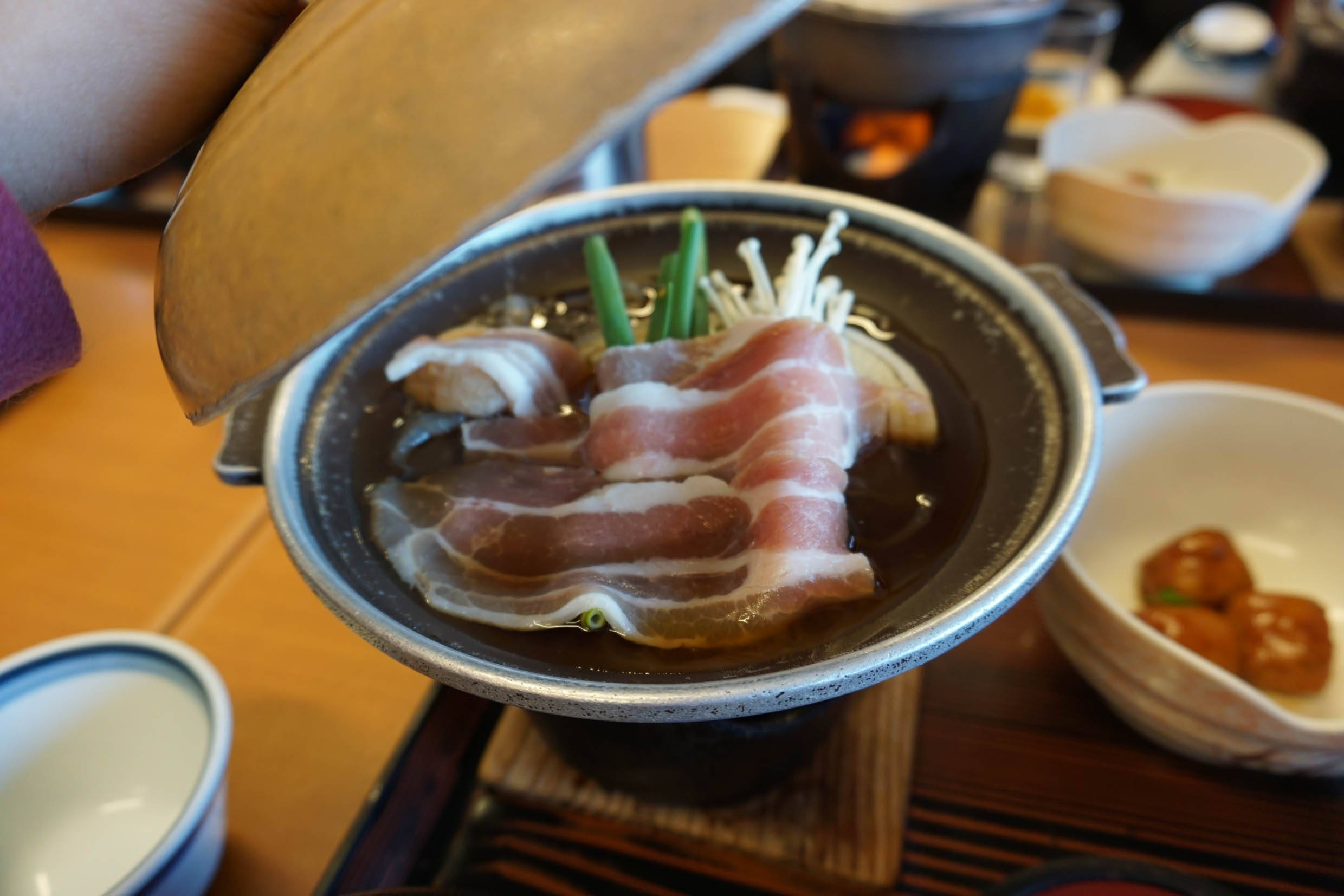 อาหารกลางวันทัวร์จัดให้ เป็นเซ็ทเมนูหมูกะทะร้อนกินง่ายๆ พร้อมเครื่องเคียงที่ดูน่ากิน มีอุด้งด้วย