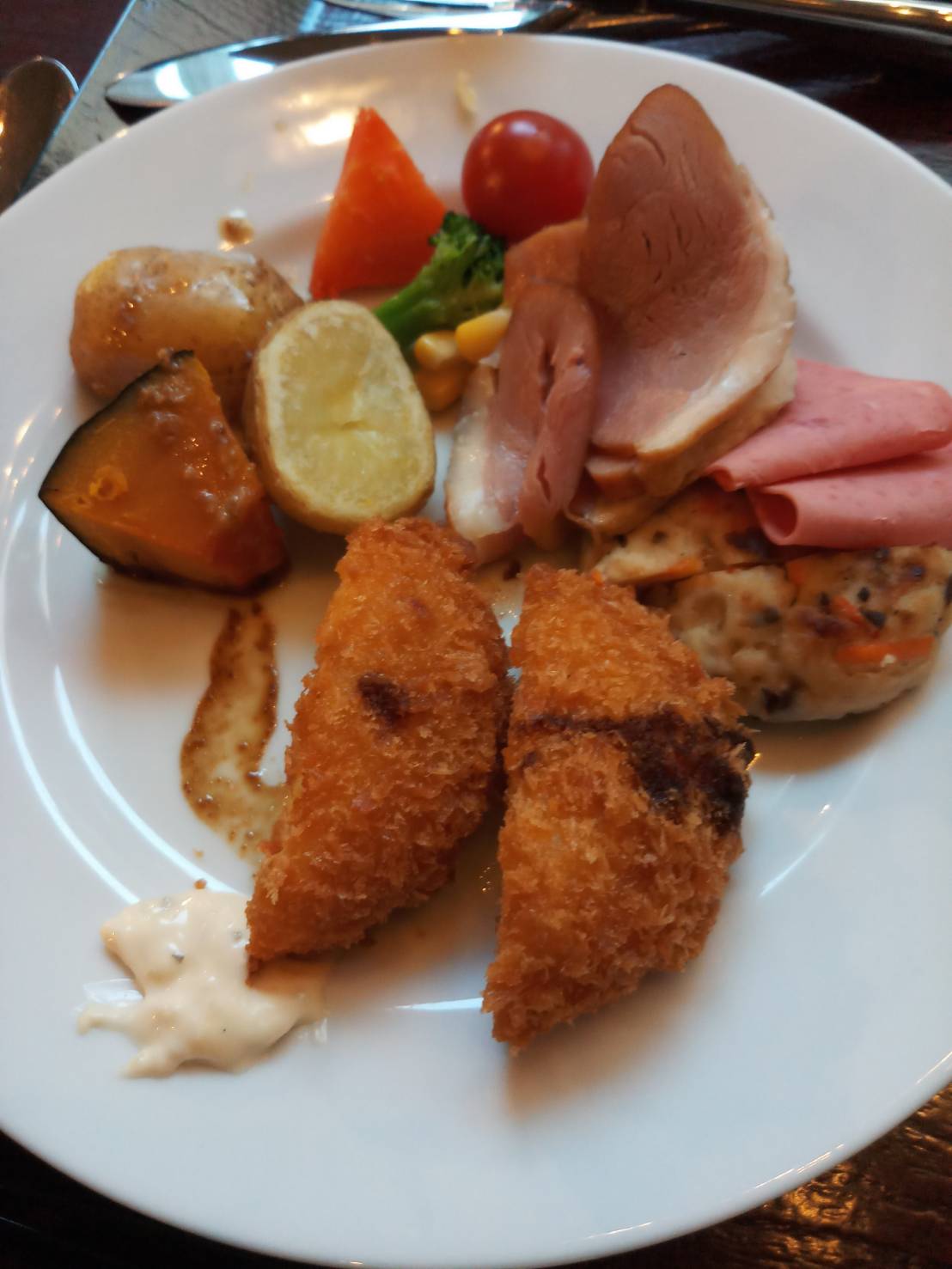 มื้อเช้าทัวร์จัดมาให้ค่ะ เป็นบุฟเฟต์ ก็ตักตามชอบ กิ๊กเลือกตักเป็ดรมควัน มันบดชุบแป้งทอด และข้าวแกงกะหรี่ ไข่คน สังเกตุเนื้อสัตว์ไม่ค่อยมี