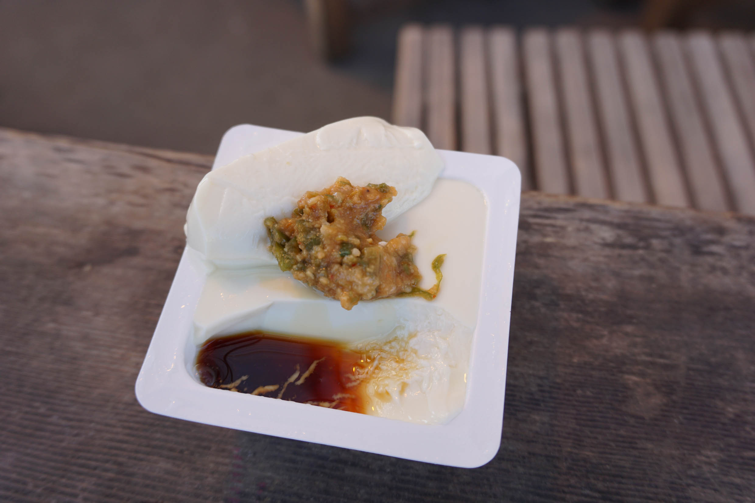 ส่วนอันนี้เป็นเต้าหู้ที่ซื้อที่นี่เช่นกัน เห็นคนรุมก็รุมบ้าง เต้าหู้นํ้าเเร่ แต่บอกเลย ไม่อร่อยอ่ะ5555555 มันจืดๆเค็มๆบอกไม่ถูก