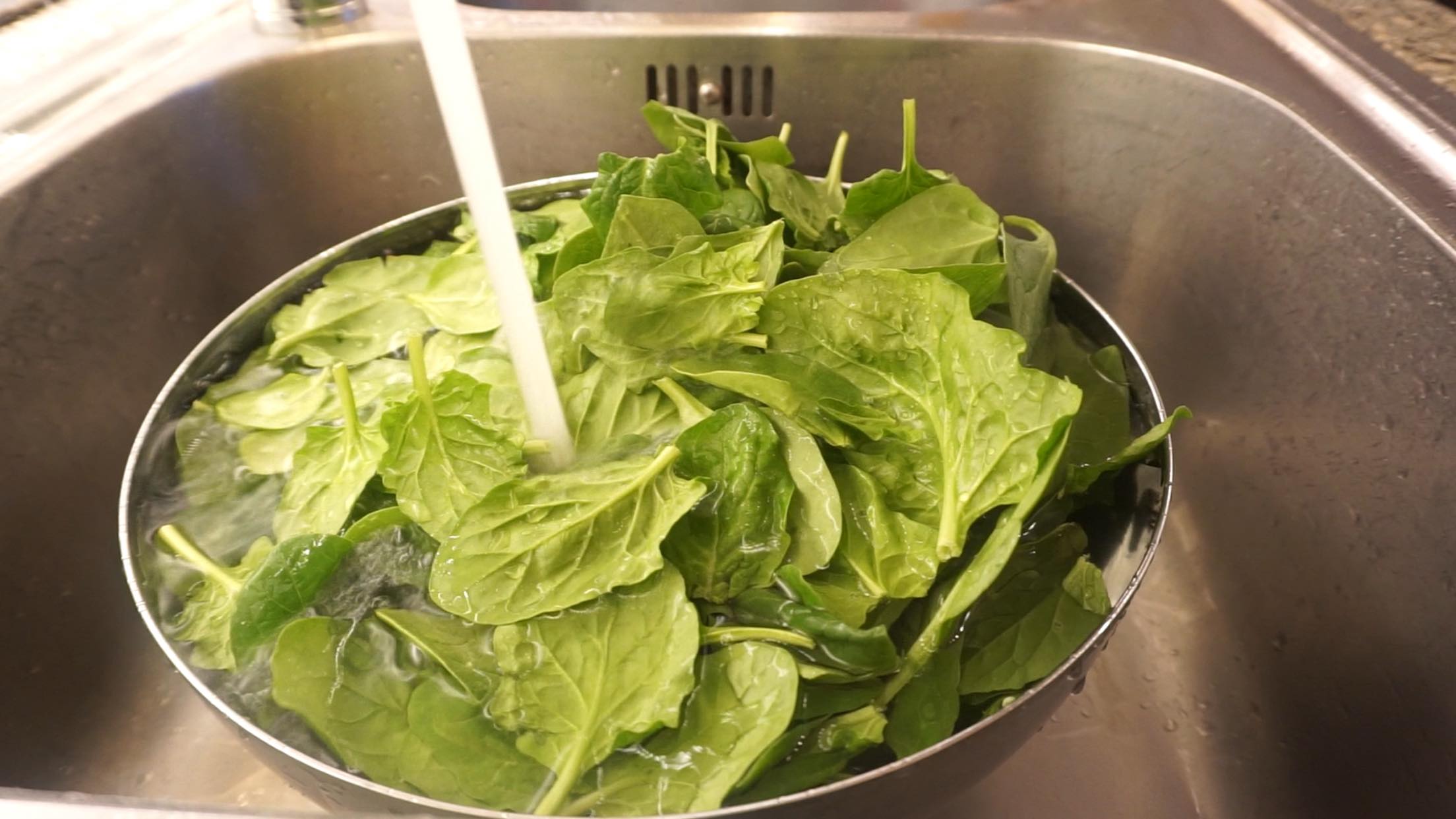 ล้างผักโขมให้สะอาด สะเด็ดน้ำเตรียมผัด