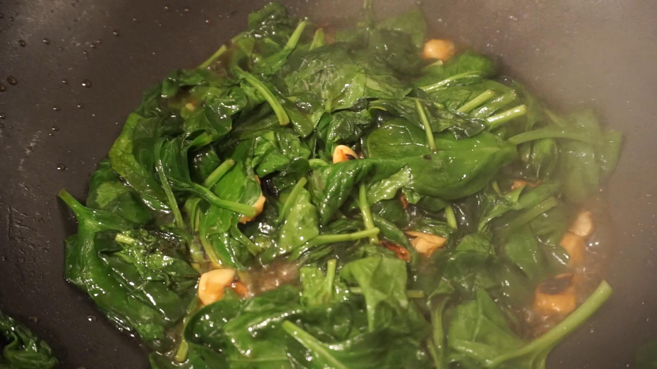 ตั้งกระทะใส่น้ำมันเล็กน้อย ใส่กระเทียมทุบผัดให้มีกลิ่นหอม ทิ้งผักโขมลงในกระทะ ตามด้วยน้ำมันหอยกับซีอิ๊วขาว
