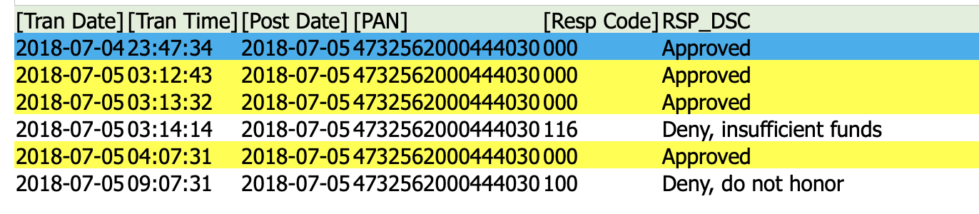 จากช่วงเวลาในตารางดังกล่าว จะเห็นว่ามีความพยายามรูดบัตรนั้น 3 ครั้งในช่วงเวลาใกล้เคียงกัน โดยที่แต่ละครั้งห่างกันไม่ถึง 1 นาที