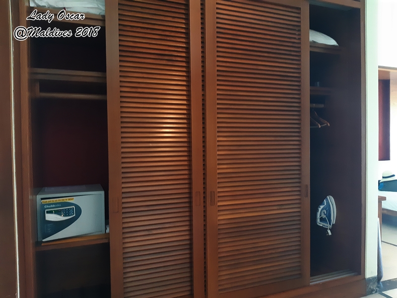เปิดประตูเข้ามาด้านซ้ายเป็นตู้เสื้อผ้า มีตู้เซฟ เตารีด โต๊ะรีดผ้า