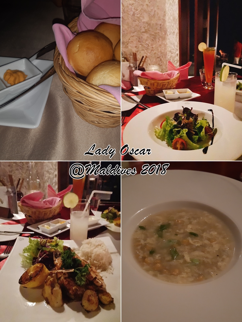อาหารประกอบด้วย ขนมปังก้อนกลมกับเนย , สลัดกุ้ง ,ซุปอะไรซักอย่าง, จานหลักเป็นข้าวกับกุ้ง ,ขนมหวาน ,เครื่องดื่ม