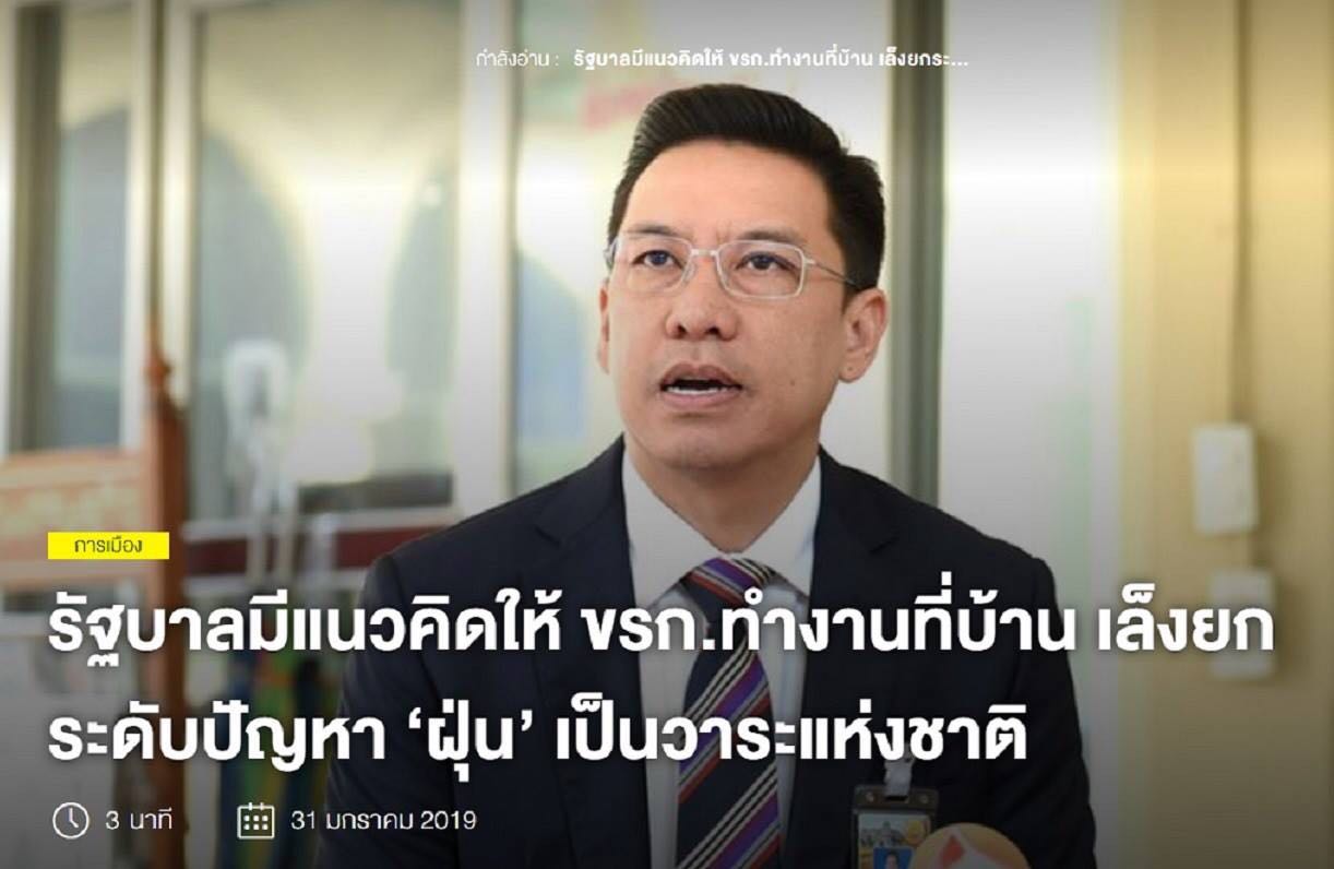 - รัฐบาล เร่งแก้ปัญหาฝุ่นละอองโดยมีแนวคิดยกระดับเป็นวาระแห่งชาติ หลังส่งผลกระทบต่อคนไทยทั้งประเทศ และมีแนวคิดให้ ขรก.ทำงานที่บ้านได้