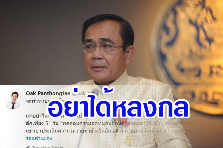 โดยโอ๊ค ระบุว่า “จะท้าทายอย่างไร...เราอย่าได้หลงกล”ออกไปไล่เขา” เรา“ทน”กับคำพูดแบบนี้กันมาเกือบ 5 ปีแล้ว เหลือเวลาอีกเพียง 51 วัน “ทดสอบความอดทนกันอีกนิด” ท่องเอาไว้ “ยังไงก็ต้องเลือกตั้ง” อย่าให้เขาเอาประเด็นความวุ่นวายมาอ้างได้อีก 24 มี.ค. บอกลาเผด็จการ เดินหน้าปชต. #ไปต่อไม่รอแล้วนะลุง”