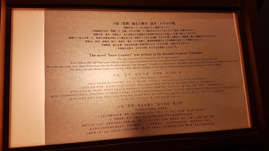 โรงแรม Takahan แห่งนี้จะมีพิพิทธภัณฑ์ ‘Snow Country’ อยู่ด้วย โดยนวนิยายเรื่อง เมืองหิมะ นี้ประพันธ์โดย Yasunari Kawabata ซึ่งเป็นภาพยนตร์สมัยก่อน ที่มีการถ่ายทำกันที่นี่ โดยมีทั้งอุปกรณ์, การเล่าเรื่อง สถานที่ถ่ายทำ และภาพของทีมงานให้ชมกันด้วย