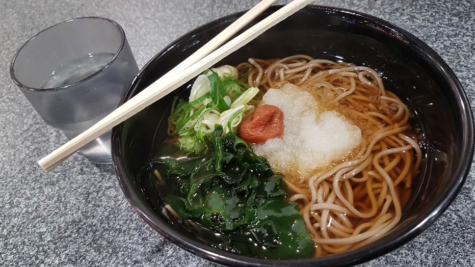 ก่อนไป เลยคิดว่าหาอะไรใส่ท้องก่อน เลยเจอร้านขายโซบะถูกๆ (ร้อยต้นๆ เยน) เลยสั่งมา และด้วยความอ่านไม่ออก เลยสุ่มจิ้มมั่วไป ดันได้โชะแล้วใส่บ๊วยดองมา??