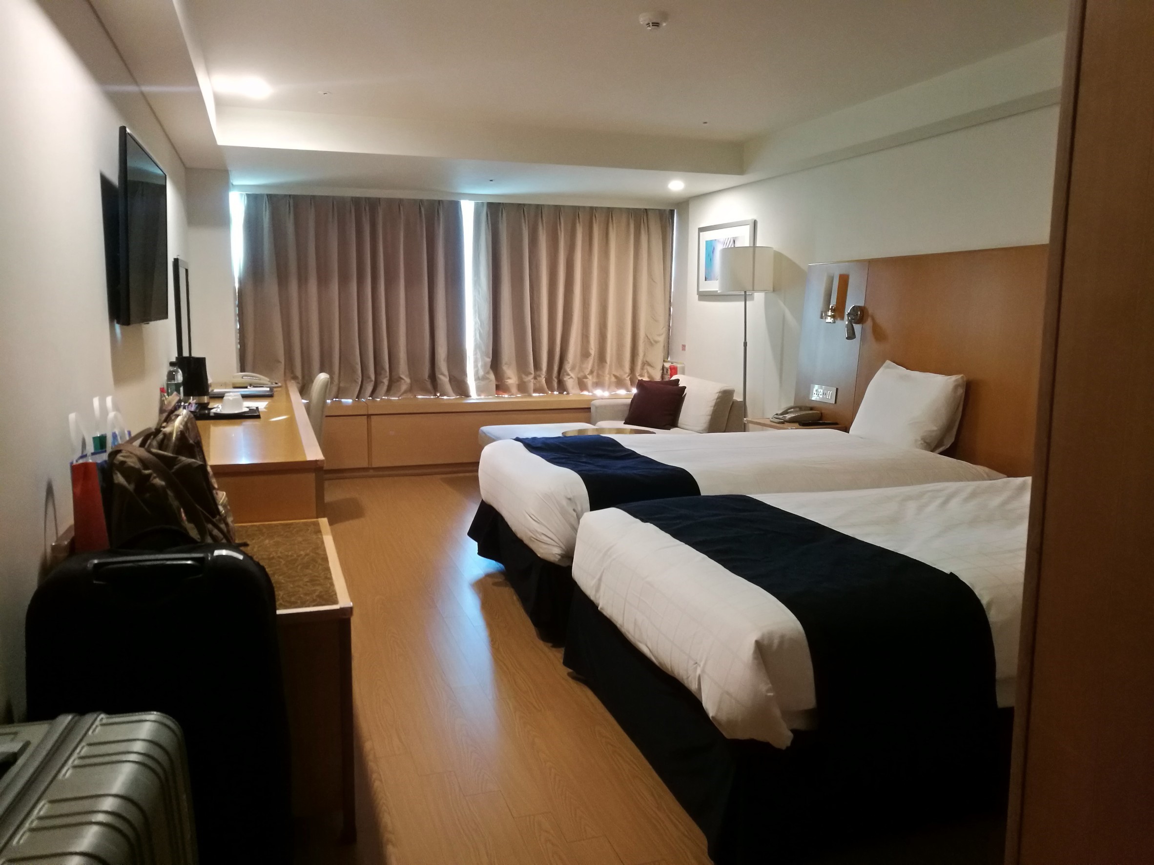 จากสนามบินเมย์และแคนดี้เลือกลองนั่งรถเมล์เข้าตัวเมืองแทกูค่ะ ขึ้นสายคึมแฮง 1(สีแดง) (금행 1) เพราะของไม่เยอะ กระเป๋าไม่หนัก (เฉพาะวันแรกค่ะ) ใช้เวลาประมาณ 20 นาที ก็มาถึงตัวเมืองรถเมล์จอดหน้าโรงแรมที่พักพอดีเลย (สะดวกทีเดียว) 2 คืนแรก เราเลือกพักที่โรงแรม Novotel Ambassador Daegu คืนละ 4,××× บาทนิดๆ จองเป็นแบบเตียงคู่ ห้องกว้างมากๆ (ไม่ชินปกติอยู่ในโซลห้องเล็กกระจิ๊ด55) เลือกพักที่นี้เพราะอยู่ใจกลางแหล่งช้อปปิ้งของเมืองเลยค่ะ ติดสถานีรถไฟ ติดช้อปปิ้งใต้ดิน ร้านอาหาร คาเฟ่ สวนสาธารณะ ป้ายรถเมล์ เอาง่ายๆ เดินทางสะดวกมาก