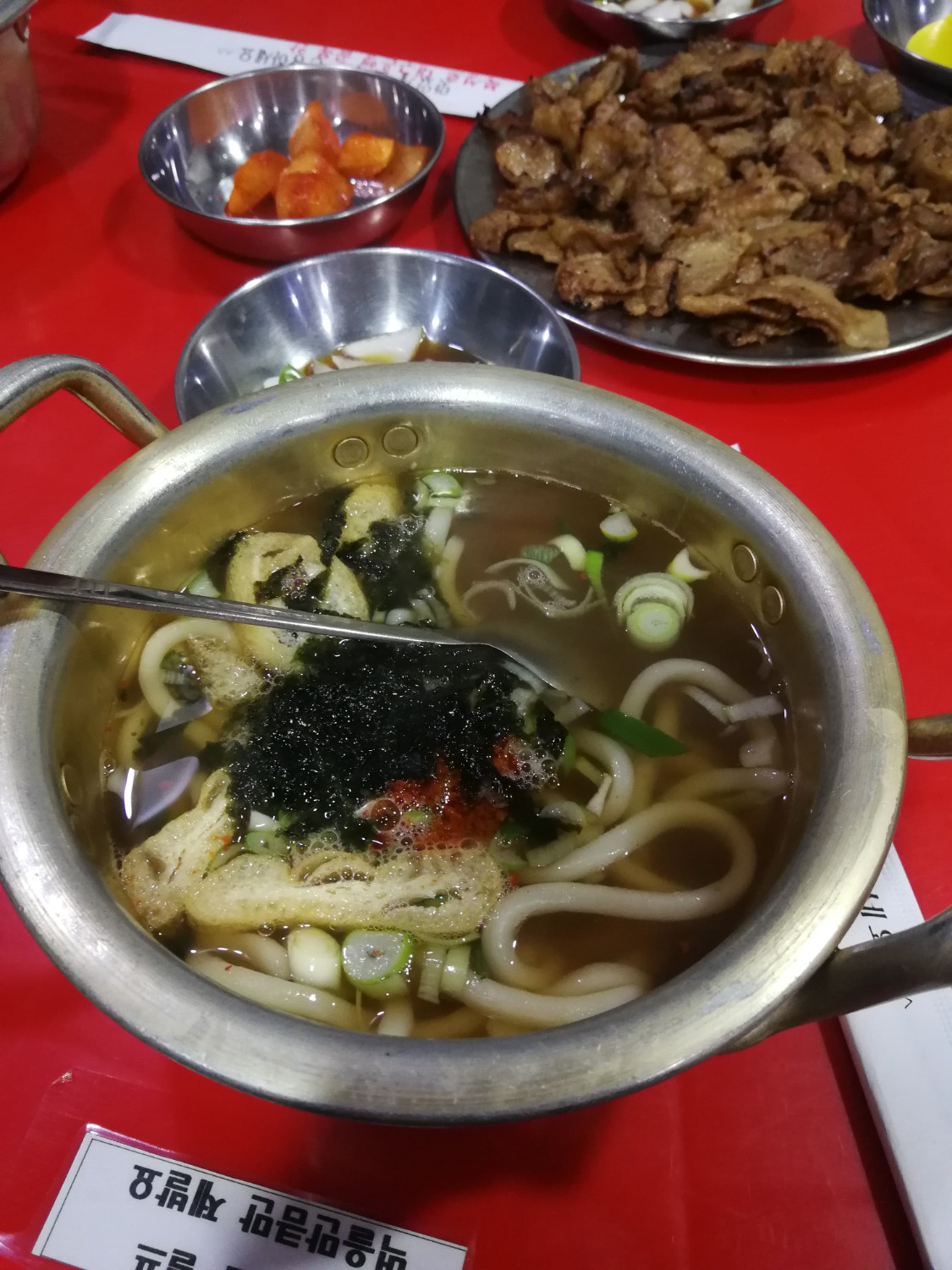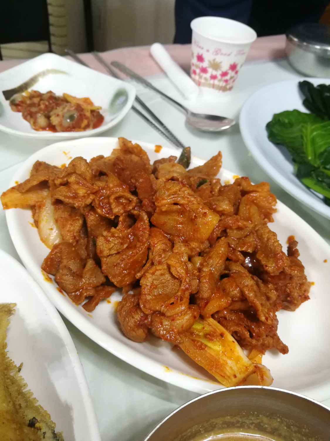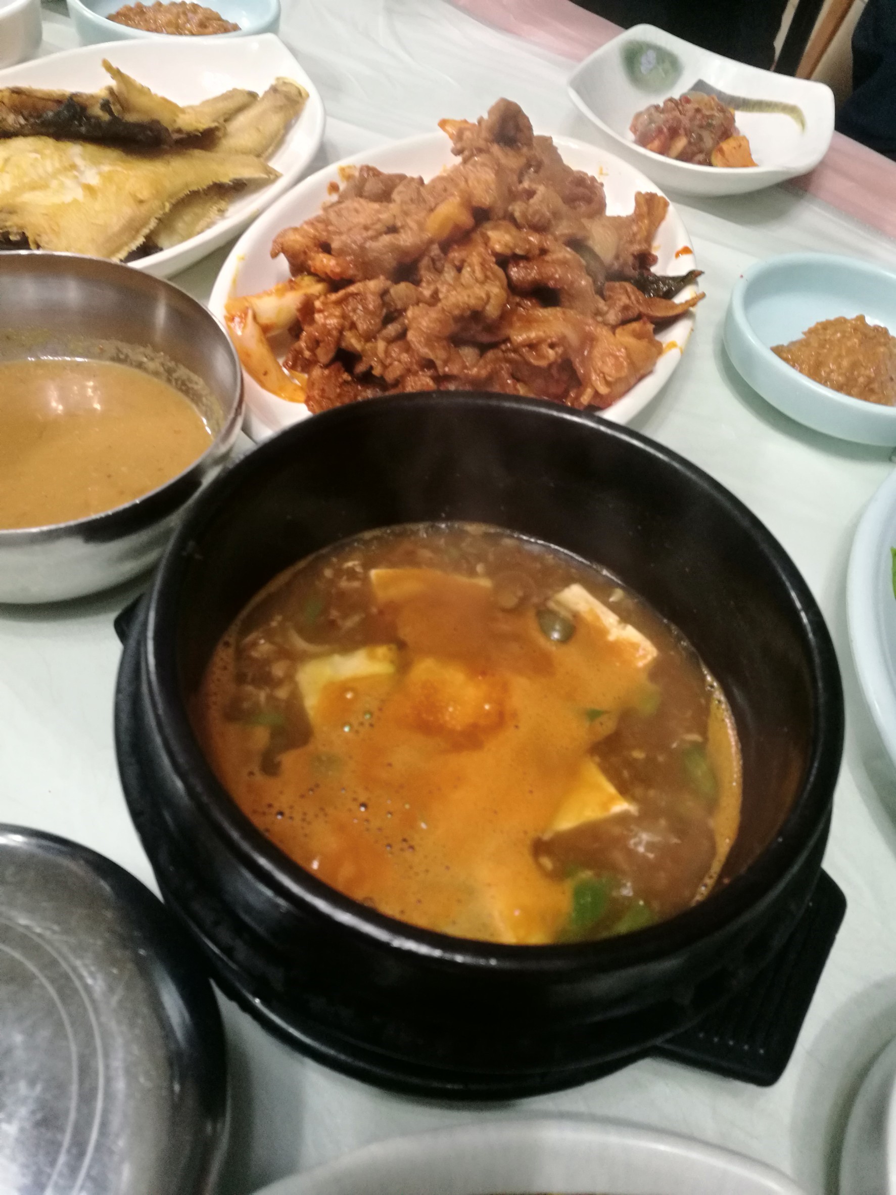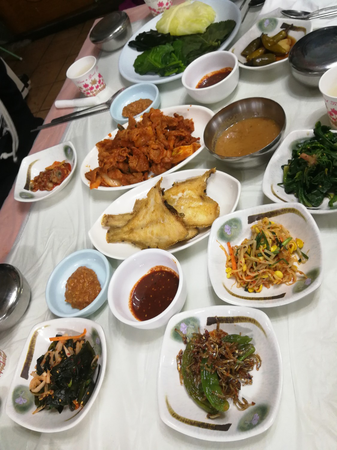 มื้อเที่ยง: เรามาฝากท้องไว้ที่ ร้านนักซันจิมบับ(낙산찜밥) ยกเซ็ทเสริฟกันเลยทีเดียว มีทั้งปลาทอด ซุปเต้าเจี้ยว หมูผัดซอสแดงพร้อมเครื่องเคียงวิธีทานก็ง่ายๆ เอาผักมาห่อทุกอย่างเป็นคำๆ แล้วทานเลยค๊าา