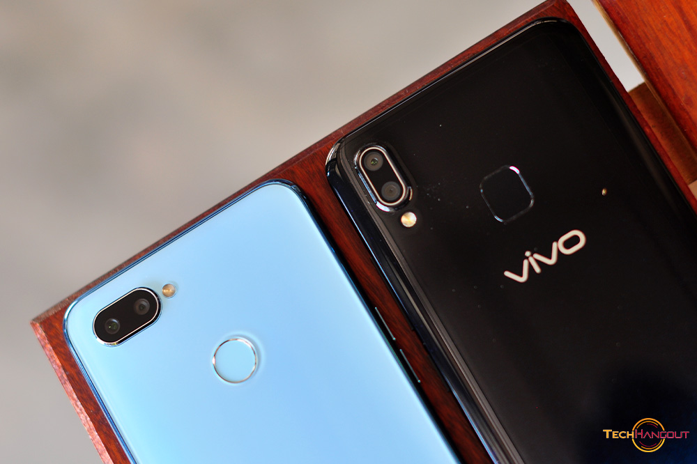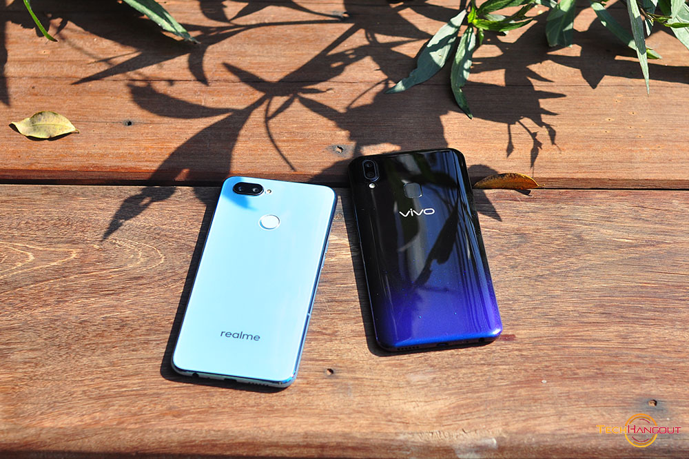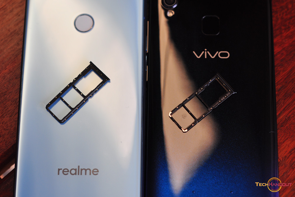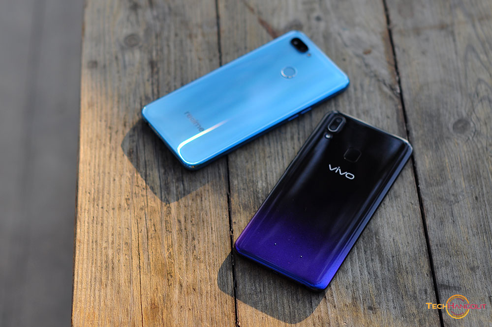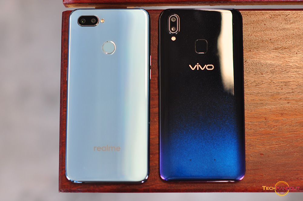 การออกแบบแตกต่างกันค่อนช้างชัดไม่ว่าจะเป็นการใช้โทนสีการเล่นสี หรือจะเป็นความโค้ง ความรับมือเวลาถือพวกนี้ครับเมื่อสัมผัสแล้วแตกต่างกันชัดเจนไม่ได้เหมือนไปซะทีเดียว ตัวทางด้าน Vivo จะทำออกมาโค้งรับมือได้ดีกว่า ดูบางเบากว่าเวลาจับถือ รวมถึงการไล่สีที่ค่อนข้างสวยและแตกต่างโดดเด่นมากพร้อมมีการเล่นสีจุดๆด้วยครับสะท้อนแสงสวยงาม ส่วนของ Realme ยังเป็นฝาหลังแบบเรียบๆ สีเดียวเล่นเลเยอร์สะท้อนแสงนิดหน่อย ด้านหลังเรียบๆไม่โค้งรับมือเท่าไรนัก แต่มีสแกนนิ้วมาให้ทั้งคู่ครับ ขนาดรวมๆไม่ต่างกันมากนักแต่ Vivo ทำออกมาแอบดูสวยและบางกว่า