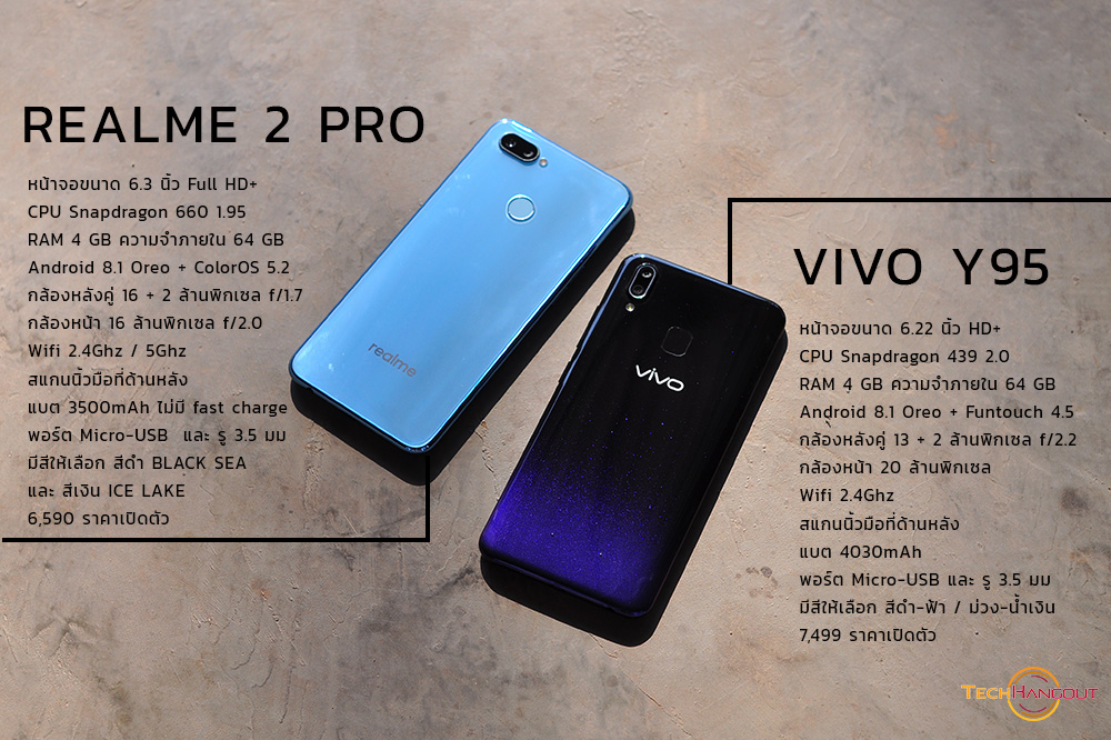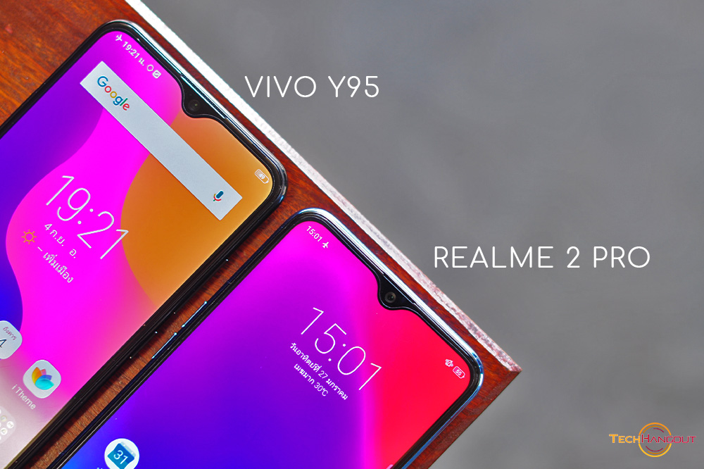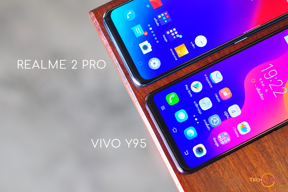 ในคู่นี้นั้นมีอะไรหลายๆอย่างใกล้ๆกันทั้งดีไซน์หน้าจอ ตัวติ่งหยดน้ำ ขอบความหนา สแกนนิ้วต่างๆรวมถึงกล้องหลังคู่อะไรก็มาค่อนข้างครบเลยแหละ รวมถึงความจำต่างๆนั้นมาให้พอๆกันเลย แต่จะแตกต่างกันหลักๆคงเป็น CPU และ การออกแบบฝาหลังครับทางด้านของ Vivo Y95 มีการไล่สีสวยงามทันสมัย ส่วนของ Realme นั้นจะเรียบๆปกติครับเล่นกับแสงเป็นเส้นๆก็สวยไปอีกแบบ ในทางด้านราคานั้นไม่ได้หนีกันมาก ครับทางด้าน Vivo Y95 มีการปรับราคาลงมา 6,999 บาทไทย ส่วนของ Realme 2 Pro นั้นราคา 6,590 บาทครับไม่นับช่วงโปรที่เหลือ 5,990 นะ