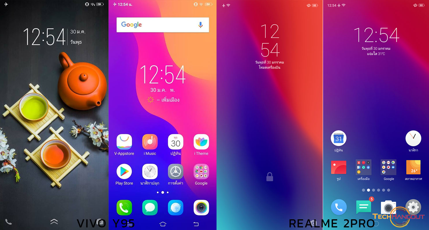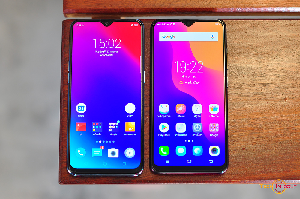 ทางด้านของระบบ Software นั้นจะเป็น Android 8.1 กันครับ แต่หน้าตาอะไรต่างๆก็เรียกได้ว่าแตกต่างกันค่อนข้างชัดเจนทางด้าน Realme นั้นมาพร้อม Colour OS 5.2 และ ทาง Vivo นั้นใช้ Funtouch 4.5 ครับหน้าตาการใช้งานก็แตกต่างกันแต่ไม่มี Appdrawer ทั้งคู่นะครับจะแตกต่างกันที่ตัวนาฬิกาที่จะโชว์แตกต่างกันไปการจัดวางตัวเลขต่างๆครับ ส่วนธีมรวมๆโทนสีก็สดใสค่อนข้างสว่างๆครับ