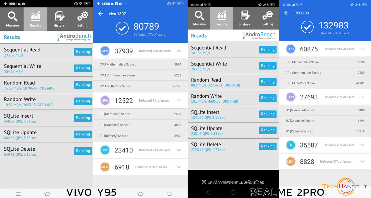 ประสิทธิภาพของทั้ง 2 รุ่นเมื่อดูสเปคน่าจะพอเดากันได้ว่ามันอาจจะแตกต่างกันเยอะครับและแน่นอนว่าผลทดสอบก็ออกมาไม่เหนือกว่าที่คิดเท่าไรคือทางด้าน Vivo นั้นทำไปได้ 80789 คะแนน ในการใช้ SNAP 439 แต่ของ Realme นั้นทำไปได้ 132983 เรียกได้ว่าแตกต่างกันแบบชัดเจนครับเยอะมากเลยในการใช้ Snap 660 ทำคะแนนหนีไปได้เยอะครับ ส่วนเรื่องของความจำยังเป็น EMMC 5.1 ทั้งคู่ครับในการบันทึกเก็บข้อมูลอะไรพวกนี้